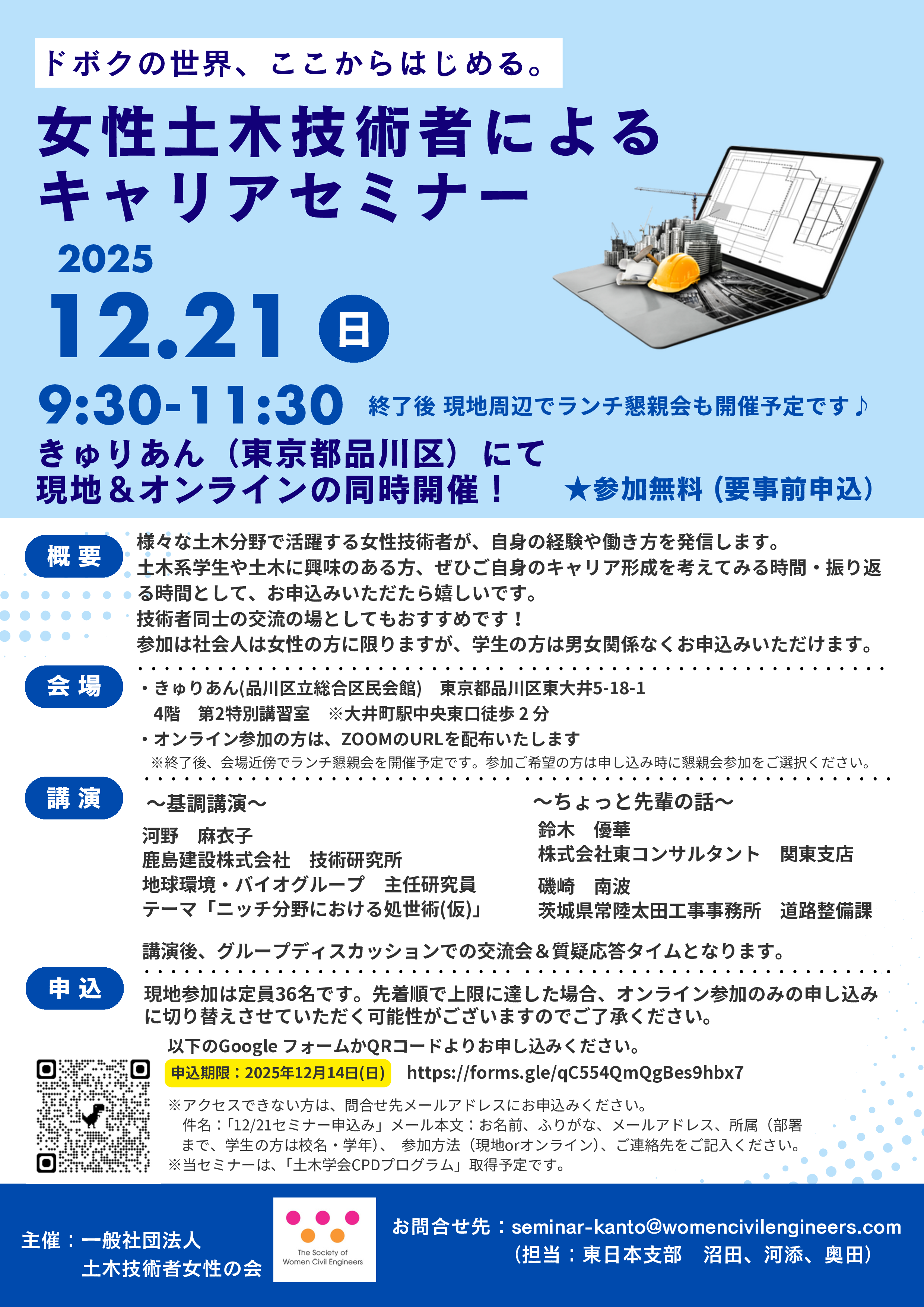 - 問い合わせ先:seminar-kanto[at]womencivilengineers.com(担当:沼田、河添、奥田)