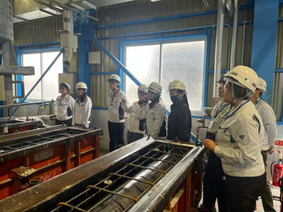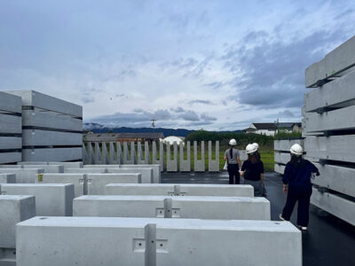 工場見学の様子。製品製作時の工夫、現場打ちコンクリート構造物との違いなどを知ることができ、コンクリート2次製品製造の工夫と技術を触れることができました。