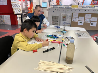 会場の様子。橋脚にお絵かきするコーナー、割りばしで橋を作るコーナー、地震による構造物の揺れを学ぶ実験コーナーと盛りだくさんでした。