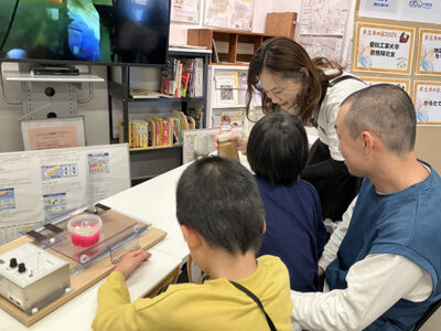 地震の揺れを実験するコーナー。地震による橋脚や建物の動きを学びました。地震の揺れ方によって動き方が全く違うことに驚きの声が聞こえました。